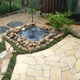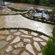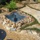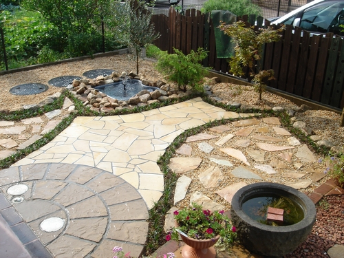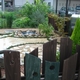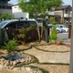 池のあるガーデン。既存のウッドフェンスに合うように自由で流れのあるラインでデザインした。池も自然な形を選び噴水と石で湧き水をイメージ、ガーデンの見せ場にもなっている。樹木が生長すれば木陰のあるより自然なガーデンになるだろう。
