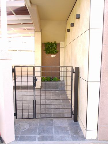マンションのエントランスリフォーム。年代を感じるエントランスをアプローチには天然石を使用し、壁にはアートボードでスッキリと広がりを感じられるようにしました。